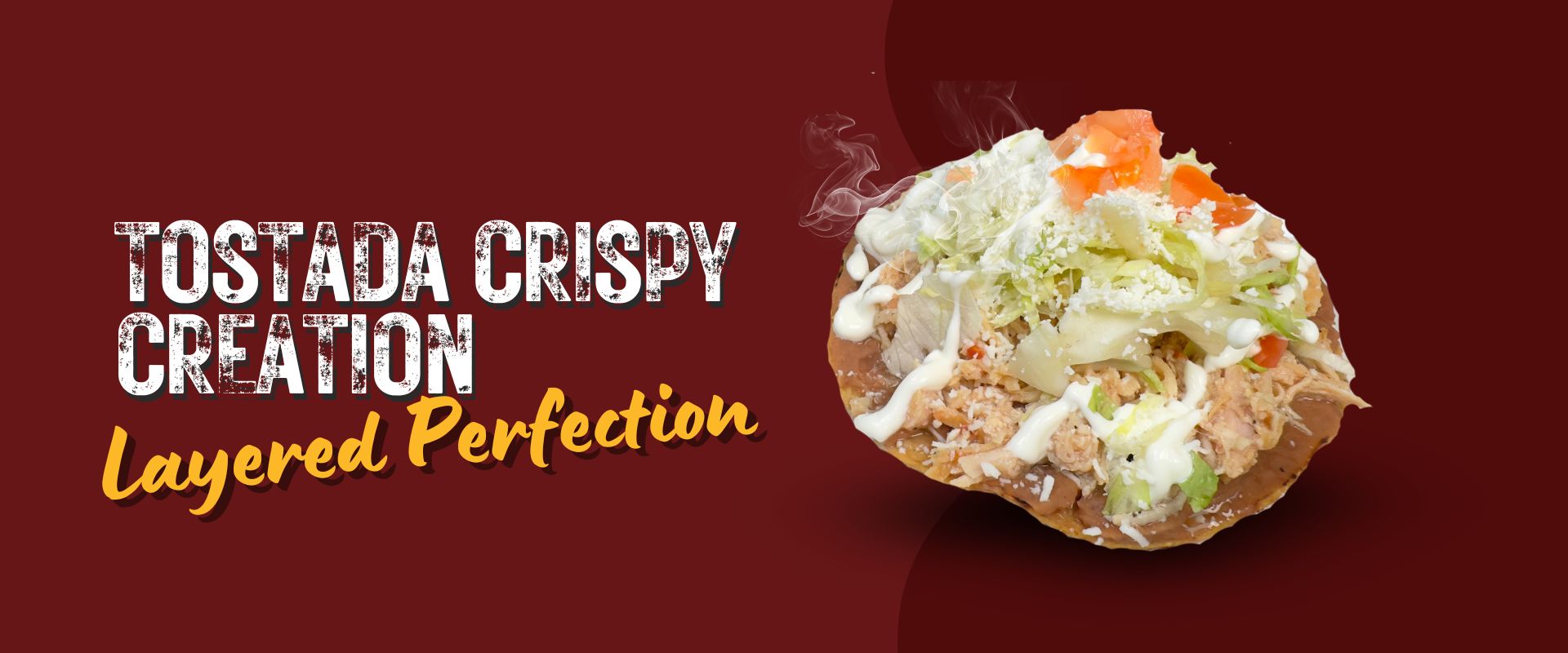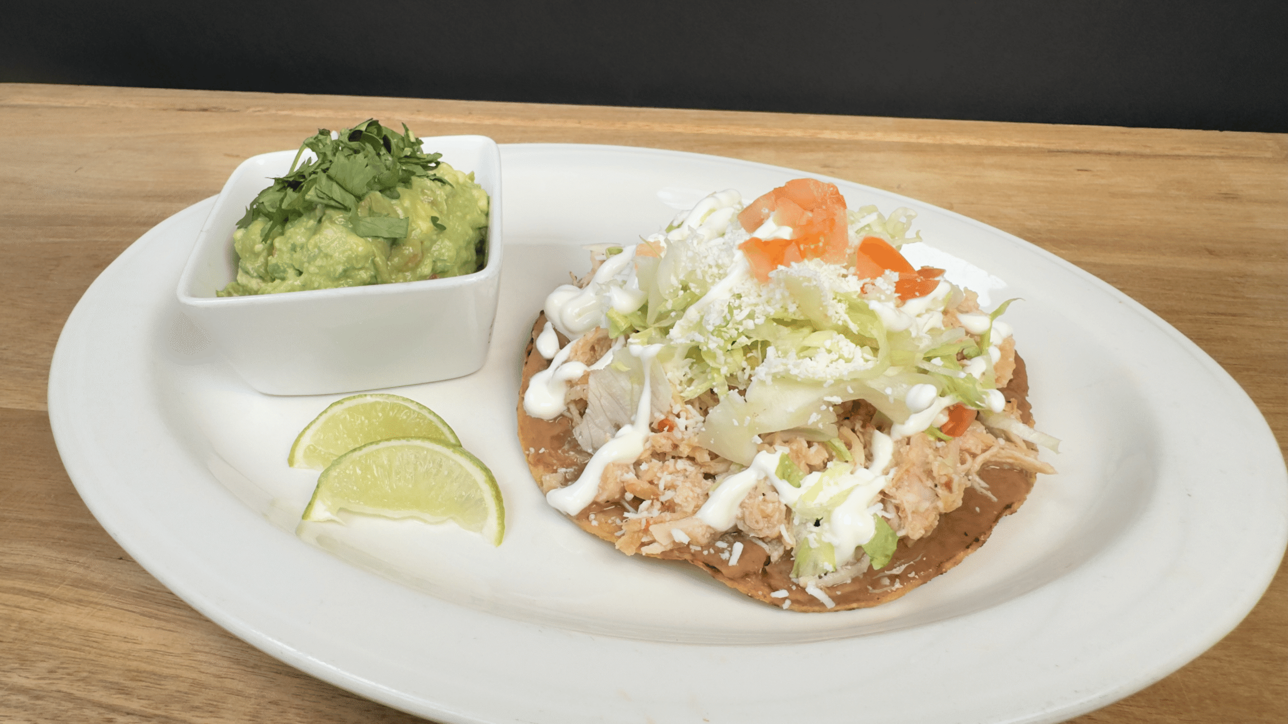 Crispy tostada with refried beans, shredded chicken, fresh veggies, queso fresco, and crema—served with lime and house-made guacamole.