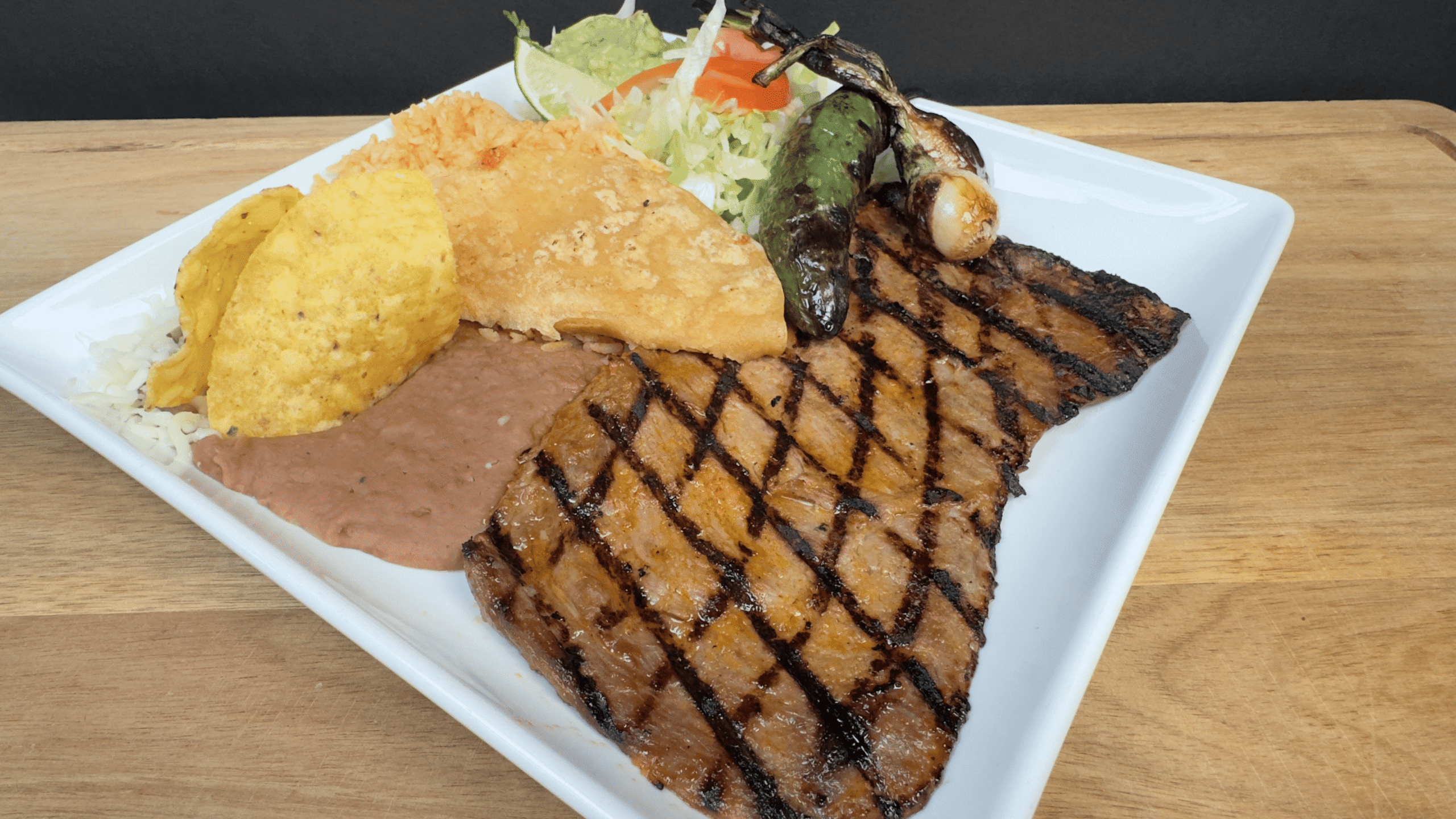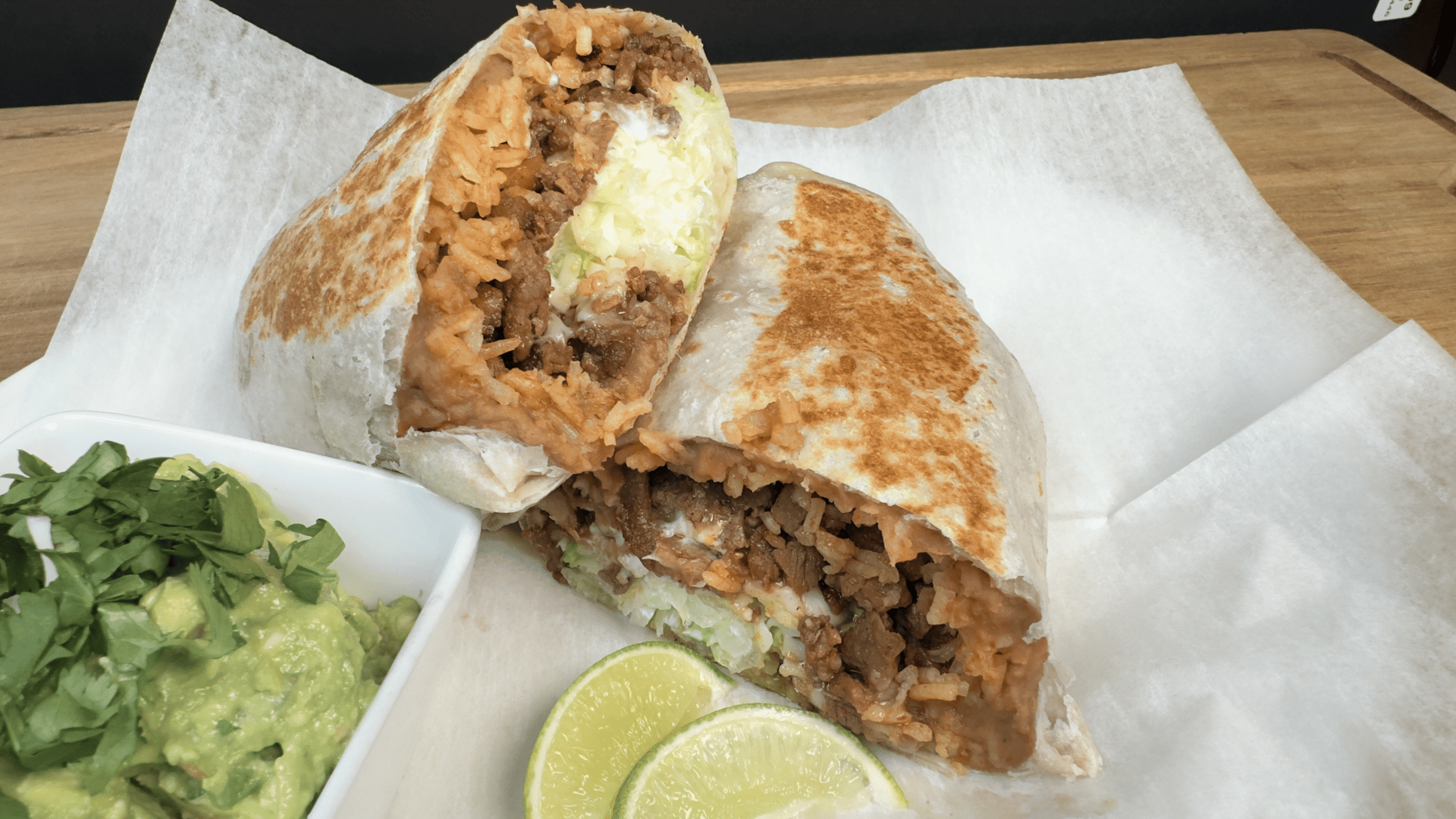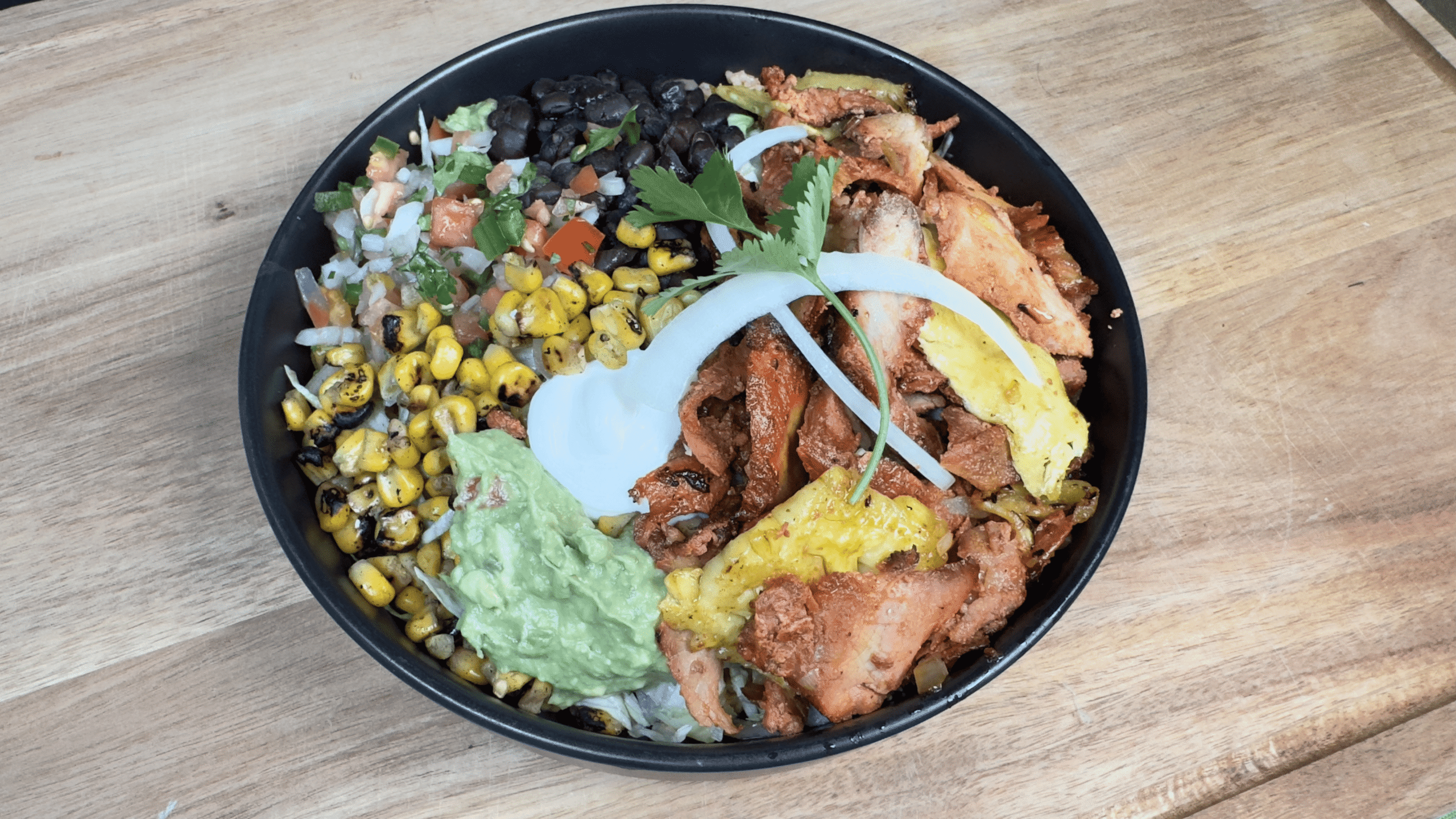 A Well Served with Chicken or Beef, cilantro, onion, lettuce, cheese, sour cream on a corn or flour tortilla and a Lemon.