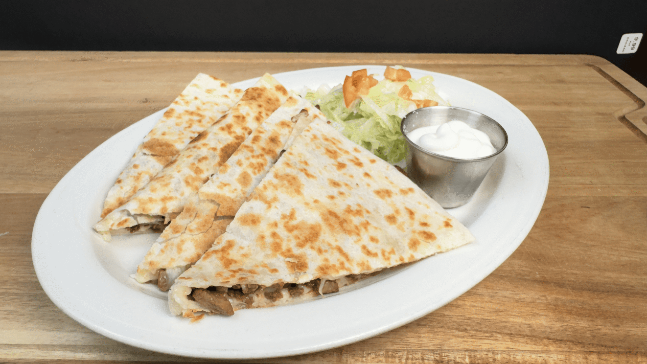 A quesadilla is a toasted tortilla filled with melted cheese, Chicken or Beef, onions, Sauce and other ingredients.